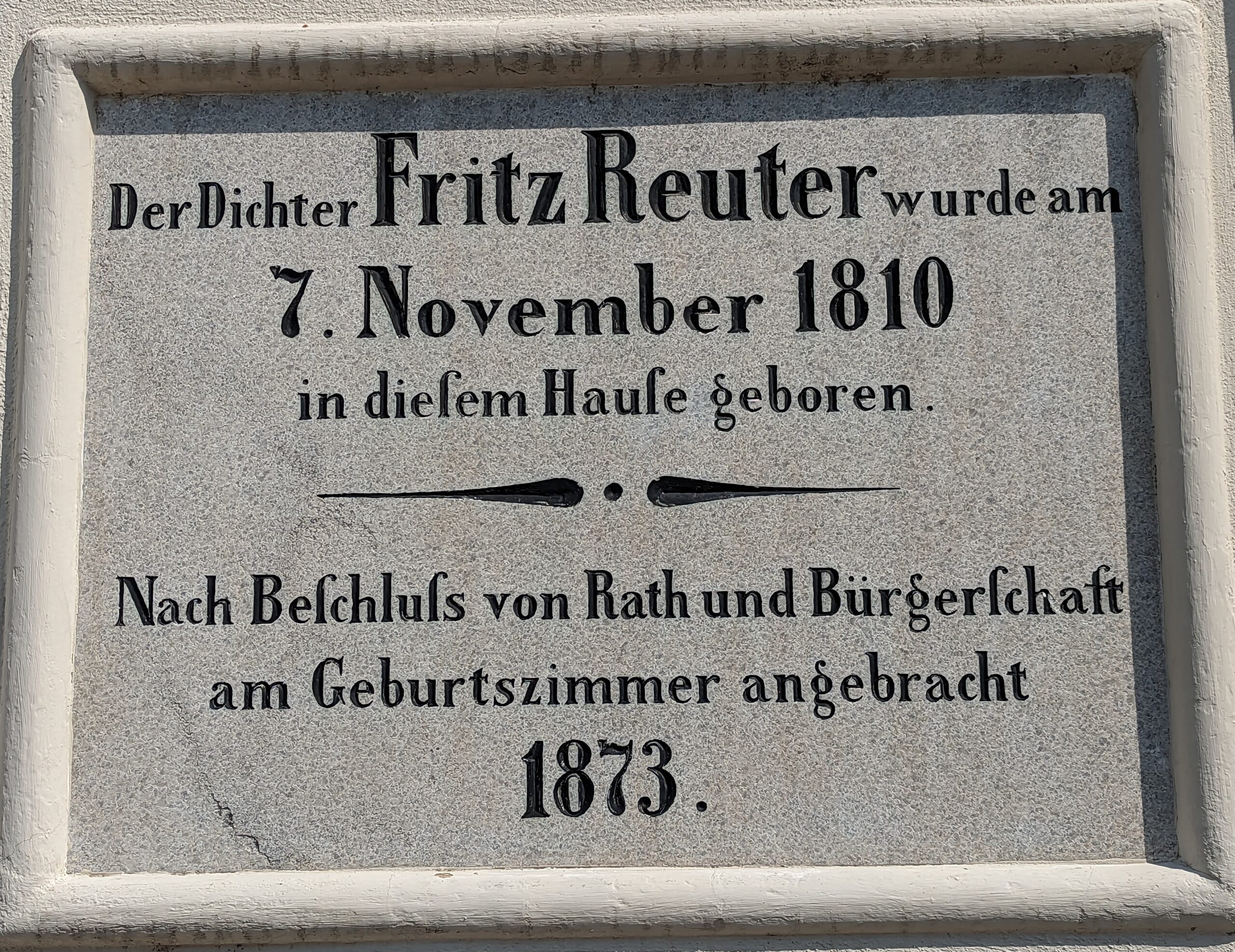 Am Rathaus soll eine Gedenktafel von grauem schlesischen Marmor mit Inschrift in vergoldeten Buchstaben angebracht werden, des Inhalts, daß Fritz Reuter hier geboren.